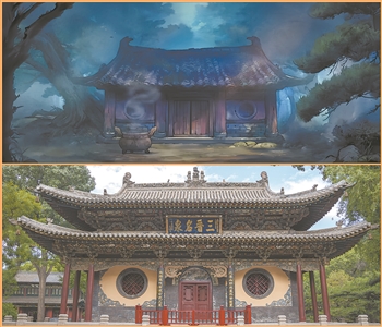 图③上为电影《浪浪山小妖怪》剧照,下为晋祠水镜台实景图。