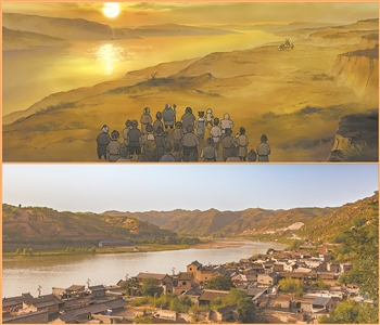 图②上为电影《浪浪山小妖怪》剧照,下为碛口古镇实景图。