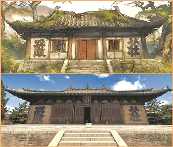 图①上为电影《浪浪山小妖怪》剧照,下为永安禅寺实景图。